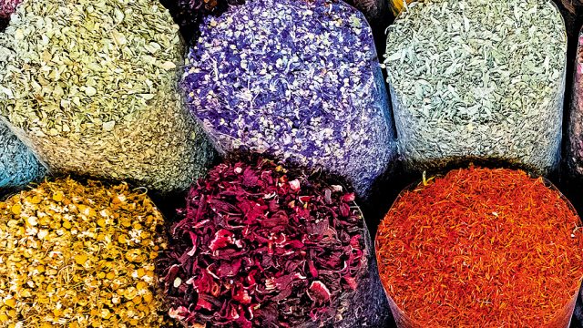 Our last stop on our eating odyssey is Sadaf Iranian Sweets and Spices on Al Maktoum Road. It’s like stepping into a Middle Eastern Willy Wonka’s factory—brass buckets piled high with dried figs and saffron-scented pistachios, dried blueberries and Arabian nougat. Hundreds of varieties of nuts—some familiar, others exotic—are showcased in sacks or glass cases. Iranian saffron, considered the world’s best, can be tasted and bought at this spice boutique.