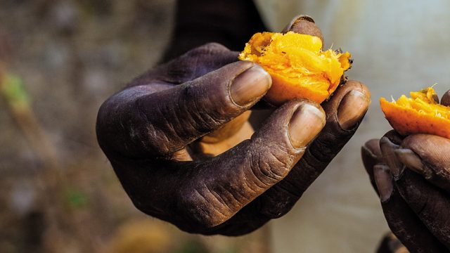 Nearly every other bush on our trail was a fruit-bearing karvanda plant, and we snacked on these sweet, juicy berries throughout our walk. Hidden in the soil underneath many of those criss-crossing vines was an underground storehouse of edible tubers, several times healthier and tastier than market potatoes, and Bua dug some out with a pickaxe to show us how much free food existed here.
