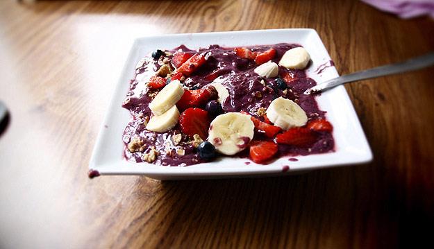 Acai are nutritious berries that grow on a species of palm in central and South America. Known as Brazil’s ‘super berries’ they have a bright, sweet flavour and are deep purple in color. One of the best ways to enjoy Acai is to eat them as a frozen puree, almost like sorbet, topped with fresh fruit (typically bananas) and granola. This smoothie in a bowl – cold, sweet, tart, with crunch from the granola – will fill you up, cool you off, and may have all kinds of nutritional and health benefits as well.