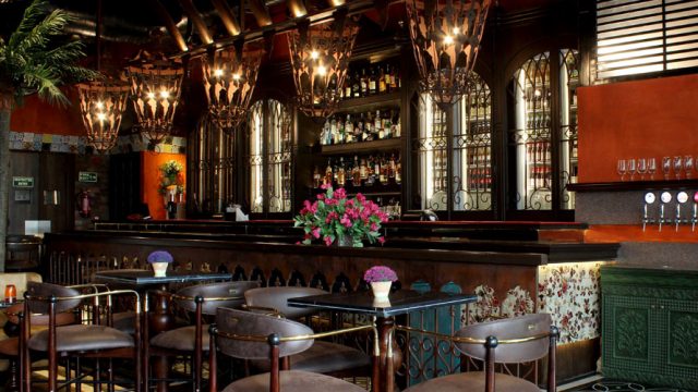 The sprawling 3500sq ft interiors follow a Latin design theme with Middle-Eastern influences. Beautifully printed Moroccan tiles have been used on the walls and columns whereas the floor is made using black and white tiles plus bricks. The jute lights and tangerine hued walls with cast iron lamps lend a earthy yet sophisticated touch to the space as a whole.