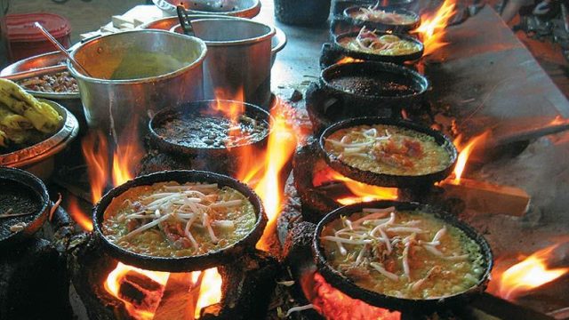 In addition to mi quang, the central region also makes the country’s best banh xeo, a sort of Vietnamese crepe. Unlike the giant, paper-thin specimens prepared down south, these are fried up on small griddles over large flames. The smoky environs lend a welcomed char and a wonderful crisp to the saffron beauties. The crepes are filled with grilled pork pieces, bean sprouts, and a dash of whole mung beans. The best way to enjoy banh xeo is wrapped up in mustard leaves and dipped in nuoc cham.