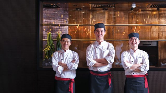 Presentation marches in lockstep with skill—the crockery makes one come over all touchy-feely, an alcove filled with pretty jars of Chinese teas is lined with their names in Mandarin carved on the wooden panel. A jasmine green samovar is on the go, right next to the Dragon Welland smoky Lapsang Souchong, blooming flower teas and tight pearls. The dim sum are decidedly decorative, with spectacular colour and garnish supplementing their elegance of shape. The private dining rooms—one has a wall full of Chinese coins for kitty luck, another a contemporary wallpaper inspired by Ming china and the largest Lazy Susan in town (serves 10). The main room has lights inspired by warriors’ shields shingled overhead, with Art Deco flourishes at floor level.Surprisingly for a Chinese restaurant, they have astartlingly extensive sake collection, featuring even inthe signature cocktail list, and Japanese whiskeys too. And the dessert menu here features Oriental flavours in technically European recipes.