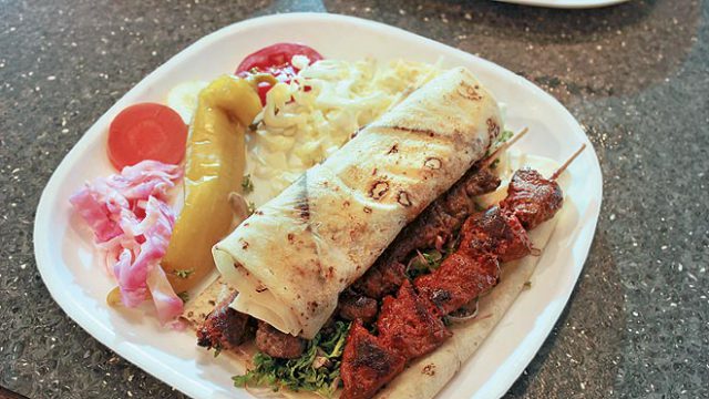Our quest for originality led us to Shawarma King (Tawakal Chambers, M.M. Road; 32028839, 9986491164; 12.30–11.30pm, Monday closed). Run by Syrian émigrés, its PR face is 16-year-old Basit. Full of beans, he proudly showed us the eatery’s brochure in which he is pictured with girlish bangs munching a shawarma roll. On his recommendation, we tried the decent but overpriced chicken shawarma, deliciously zangy grilled chicken Maria and slightly over salted grilled mutton Maria served on skewers with insipid roomali roti and too much salad.
