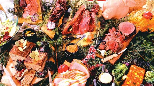 It’s customary to begin with sill(herring), prepared in many ways: fried and pickled in vinegar and chopped onion, or marinated in mustard, or with red onion and sour cream. This is usually followed by other seafood: jellied eel, smoked fish, and raw picked salmon. A particular favourite is the gravad lax: salmon marinated in sugar, salt and dill, and served with a cold sweet-and-sour mustard sauce. Diners then proceed to the cold dishes: baked ham or liver paste, accompanied by vegetable salads. Hot dishes, often Swedish meatballs, are next in line, backed up by cheese and crackers, and perhaps a fruit salad.