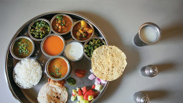 It’s all worth it for a single reason: the food. Minutes after a table is finally occupied, the plonking, sloshing and force-feeding begins. A fiery, red garlic chutney, a spirited green chutney, immodestly orange pickles, salads and chopped green chillies are placed along the edge of an enormous thali. Then comes an array of sinful snacks — crunchy samosas, satiny khandvis, crisp mirchi bhajias or flavour-packed kachoris. Next in line is the waiter bearing an assortment of vegetables and pulses, which he ladles into four katoris. Another cheery soul spoons out addictive dahi kadhi and characteristic sweet dal. Then comes the enthusiast with the roti tray — ghee-kissed chapatis, little bajra rotlas, crumbly biscuit bhakris. Somewhere along the way, a glass of chaas appears, with bowls of creamy dahi and gulab jamuns. And before you can decide whether the mixed pulses are yummier than the potato, it’s time for tough decisions. Another biscuit bhakri or an extra mohanthal mithai? Khichdi or rice?