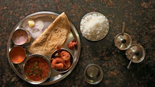 On the land side, the regional speciality is kombdi vade, chicken curry mopped up with a puff of fried bread (vade). Fried fish and seafood ‘Koliwada style’ is the contribution of Punjabi migrants from Pakistan who settled in the Sion Koliwada area. Cashews are treated as a vegetable and made into bhaji or curry or amti, while jackfruit is beloved as both fruit and vegetable. Breads here are quite different from mainstream India. Besides vade, there is amboli (like a dosa) and bhakri (a particularly robust roti) made of rice flour, sweet khaproli (a pancake dipped in syrup), mesh-like fried ghavan and sweet cucumber cakes called dhondas.