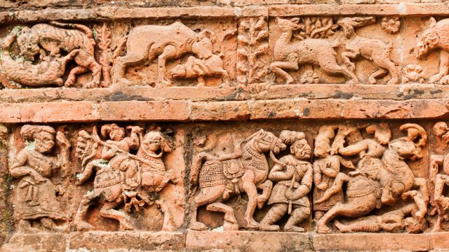 One of the most popular destinations exhibiting the rich cultural heritage of West Bengal is Bishnupur, about 130km by road from Kolkata. The temples, dating between 17th and 18th century, with their decorative terracotta panels are the biggest attractions here. Jorebangla Temple with its typical Bengal style roof joined together, Madan Mohan temple, the five-spired Shyam Rai Temple, etc., speak volumes about the architectural heritage of Bengal. The pyramidal Raas Mancha seen here is a unique structure. Bishnupur is home to indigenous silk textile, especially the Baluchari sari. The terracotta art lives on through the clay toys and other decorative artefacts manufactured here. It is also home to the Dasavatara (Ganjifa cards) cards and patachitra (scroll) paintings.