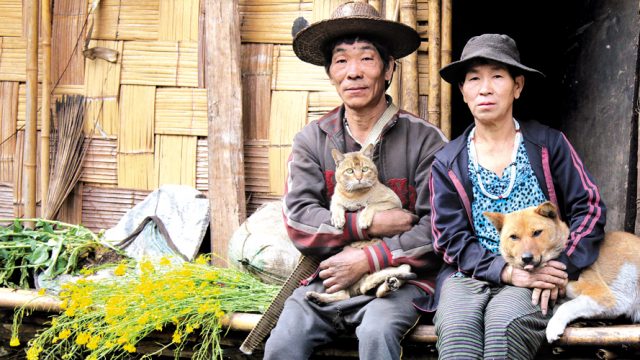 Before we left they sat on their porch for photos, Kormu clutching the cat to his chest, Mishing with her arms around the foxy dog, a parody of an English family portrait. Edi then took one of the three of us, and Mishing posed with a bunch of mustard flowers and held my hand tightly in hers. When we hugged each other warmly goodbye, I couldn’t believe her diminutive, bony frame had survived 11 childbirths. They’d miss me, they said, and asked when I was coming back, then we all waved and shouted ji pra ji, stay well, until we were well out of sight. I was sad to say goodbye and leave them, alone, for another solitary day of graft in the fields. What a life they lived.