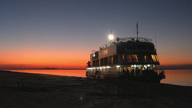 Shortly after sunset, the vehicle left the highway and turned into a dirt track. Bouncing us gently up and down for about a kilometre, it stopped at last. Shadowy figures hidden behind torchlight beams approached us. This was the welcome team from the Mahabaahu. One of the men shovelled the sand into the shape of makeshift steps, helping us down the slope. Up ahead, the ship radiated light like a horizontal Christmas tree.