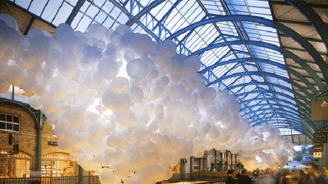 If you are in London between now and September 27, 2015, visit the Covent Garden Market to see the pop-up art installation executed by French artist Charles Pétillon, an expert in creating balloon structures. The installation, titled Heartbeat, consists of 100,000 white balloons pulsating with light. The 54-metre long and 12-metre wide structure can be seen stretched across the roof of the market’s South Hall. This is Pétillon’s first balloon sculpture display outside France. With Heartbeat, the artist wanted ‘to represent the market building as the beating heart of this area – connecting its past with the present day to allow visitors to re-examine its role at the heart of London’s life’. The sculpture is part of Covent Garden’s annual cultural programme. There will also be a pop-up gallery in the piazza showcasing his previous work.