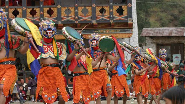 Winter in Bhutan is the time for festivals. Many of the leading dzongs (fortresses, now administrative hubs) and monasteries hold the annual Tshechu festival at this time of the year. Cham or mask dance is a part of the Tshechu festivals. These colourful and energetic dance programmes are considered to provide protection from misfortune and exorcise evil influences. At many places, a thongdrol (which means ‘liberation on sight,’) – usually a large thangka or scroll – is revealed to confer blessings on those assembled. The Tshechu and other festivals are also seen as an occasion for families and friends to come together; people walk long distances to attend the festivals. Hence, arrive early at the dzong or monastery to secure a vantage point, especially if you are a photographer.