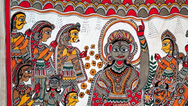 In a typical Madhubani, you are likely to find depictions of the sun, moon, the tulsi plant, fish, birds… and deities like Durga, Shiva, Krishna, Rama, Lakshmi…. Other motifs are bamboo groves, a pair of birds facing each other and entwined snakes. Scenes from a royal court and social occasions such as a wedding may also be painted.