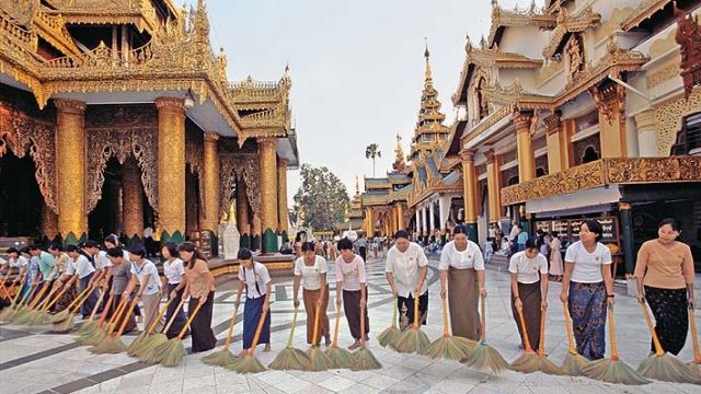 At the entrance to each of the major pagodas is a pair of lion statues. When we go to the Shwe Dagon Pagoda in Rangoon, which is quite the largest and most splendid of them all, the guardian lions are also very large. The pagoda itself is like a giant mountain of gold rising out of the city. We observe an amazing feat of co-ordinated cleaning—volunteers, ten or fifteen in a row, wielding large, closely aligned mops, walk slowly around the circular courtyard sweeping the path clean for visitors. Acquiring merit by performing such acts is an important part of the Theravada Buddhism that is followed in Burma.