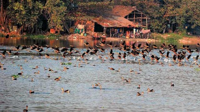 What the birds, and the Jheel, are up against is easily visible. And heard too — trains whistle from the northern periphery, passenger announcements float in from the Santragachi Railway Station, amplified Hindi film music is heard from the shanties in one corner, while rickshaws and bicyclists press on their bells in the residential area flanking the other end of the Jheel. Hemmed in from all sides, there is the other constant drone — thousands of birds merrily chirping away from small islands within the lake.