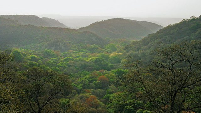 In the middle of this nowhere, Pradip Krishen, author of Trees of Delhi who I am accompanying, stops the car. We walk for about ten minutes, winding our way past rocks hugged by stunted plants, between trees twisted by hot dry winds. It is eight o’clock on a morning in late March and it already feels like summer. And then, suddenly, we arrive at the lip of a cliff. The ground drops away and so does my jaw. Spread out below us is a deep wooded valley, densely yet delicately green, the expanse of its tree canopy broken only by the whitewashed domed tower of a small shrine in the distance. Besides the shrine, the only other sign of human presence is a boundary pillar on the far end of the valley. That’s it; the rest is undisturbed forest. The only sound is the plaintive call of peafowl, the only movement their ponderous glide from one tree to another. Oh, there’s also the racket of parakeets arrowing across the sky. Some grasses waving as the breeze catches the outcrop of rocks below our feet. Everything else is still. We could be in the middle of Sariska National Park except that we are not. We’re in Delhi NCR, twenty minutes away from the wall-to-wall carpeting of tarmac-glass-concrete-stone, twenty minutes from traffic jams, crowds, noise, dust and smoke. It feels like we’ve landed on a different planet.