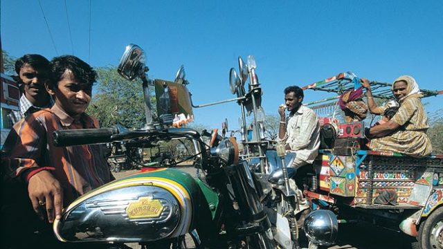 We stop to speak to the drivers and finally learn its local name: chakda. Each also has a personal name, such as Bansuri or Chandni or Kanhaiya. The bike-and-cart hybrid isn’t a rejiggered motorcycle after all, but the original design of a Jamnagar factory. Even the lavish paintwork is factory-bestowed, but some drivers go the extra mile to decorate their vehicles and adorn the headlight with shiny accessories called mukut and kaan.