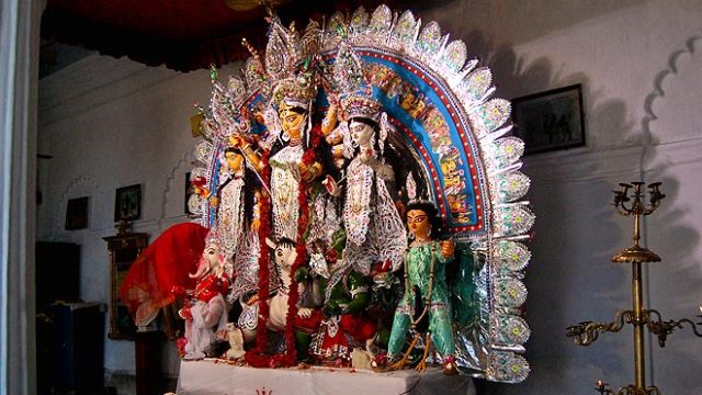 After Robert Clive won the battle of Plassey in 1757, Raja Nabakrishna Dev of Shovabajar Rajbari feted Clive and other members of the East India Company at home during Durga Puja. A festival that was restricted to household now became a popular attraction. Even today people flock to this traditional household in north Kolkata to observe the age-old customs and rituals being followed during the festival. Like most traditional homes, here too the goddess and her family share one backdrop (locally known as ekchala)