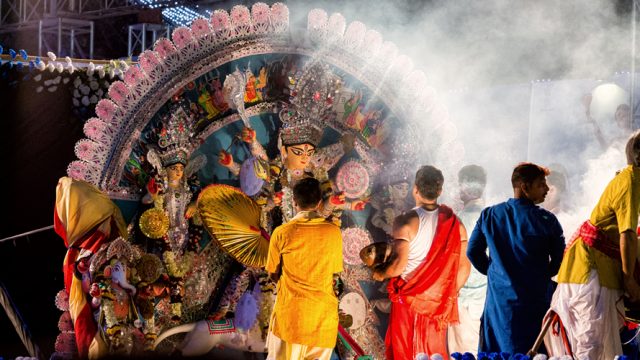 Imagine Disneyworld and the Rio carnival, add elements of Mardi Gras and the celebrations at Tenerife with unique artistic and creative Maa Durga idols on massive floats, each decorated with themes pertaining to today’s reality – education, Indian diversity and communal harmony among others; laar paar shada saree (traditional white sarees with red borders) draped quintessential Bengali women; intricately-designed kurta-wearing and dhunuchi-bearing gentlemen; children performing traditional Indian dances and skits — does that give you a glimpse of the celebrations that erupted on the final day of the revelry? It’s that time of the year when one must visit Kolkata to witness the celebrations first hand. Words don’t do justice to the feeling that underlies it all.