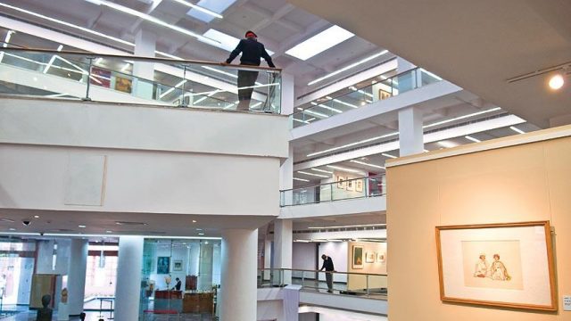 The gallery floors are airy, light-filled and open—they have no walls to divide them and the stands on which the paintings hang are moveable, which make for an extremely flexible display space. There are also odd nooks and crannies where you may happen to chance upon an interesting sculptural piece or installation.