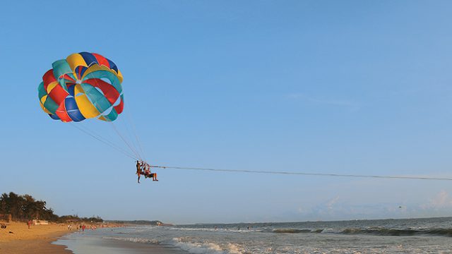 Then I see people flying. That didn’t happen in 1977. At a distance from the beach, we can see parachutes erupt from the ends of motorboats, and hoist stick figures into the sky. This seems at once so magical and so seductively modern that we sign up immediately. We are ferried out to sea, where we climb into the parachute boat. We are kitted out with life-jackets; I asked the man at the wheel if they’ll be necessary. He shakes his head and says, reassuringly, “Boat to boat, boat to boat.”