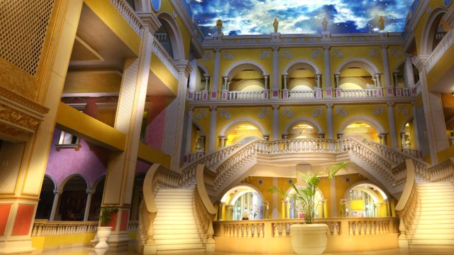 It came across as a Venice-themed shopping complex almost immediately, but there was a lot of Rome about it as well. The exterior had arches, gothic roofs, golden-hued Romanesque sculptures and mild colours, while the interiors had vaulted ceilings. Outside the main building, there was a fountain inspired by Rome’s famous Trevi Fountain. But I was most taken aback by the inside portion of the front entrance. We passed through the entry, walked to the centre of the lobby, turned around and saw a decorated wall that was certainly not gothic, but unabashedly baroque—an intricate pattern of trees and its branches embossed on a beige wall, shimmering underneath the light of a massive chandelier.