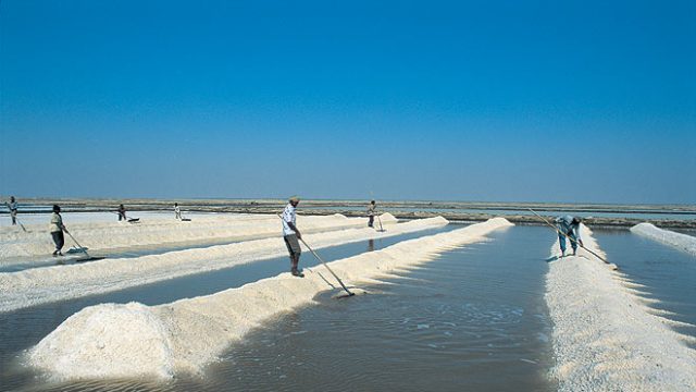 The meeting of these waters sustains a thick seafood cocktail of small fish, prawns and other crustaceans that are nourished by the mix of salt water blown in by the wind and the monsoon runoff. And it is this rich feed that, in some years, attracts many thousands of flamingos to the southern edge of the Little Rann. The salt flats are transformed into great marsh swamps which make travel next to impossible. But as the area dries up by the end of October, the salt crystals begin to glitter in the winter sun and the extraction process begins again. Almost 25 percent of India’s salt comes from the Little Rann.