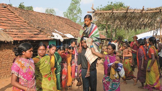 At the pump, women and girls were already splashing and teasing each other as we took photos and introduced ourselves with smiles. They talked to us mostly in laughter, with some Oriya and Hindi words thrown in. A pandal stood in the middle of the lane, the wet leaves on its canopy drooping, and that was the first hint that something special was afoot. The sound of music drew us to the stream east of the village, where a piper and two drummers kept up a sometimes tuneful but mostly repetitive din. At the water’s edge, a woman held a struggling bird and Rita explained that the women were sacrificing a chicken. Other offerings were assembled in banana leaves, put into clay pots and loaded — with a ritual ululation — on to the heads of freshly bathed and dressed young girls. They held the load, necks trembling with effort, till the priestess was ready; then they all came up the bank and went along to the house where a wedding was to be celebrated the next day.