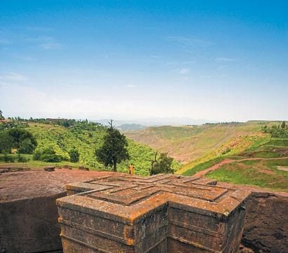 Narrow passages and sloping tunnels cut through the rock connect the churches. As we negotiate our way around, a blind priest comes through a narrow ellipse in the stone. He doesn’t miss a beat on the uneven floor, but counts off his rosary as he walks, following a map only he can see. We work our way through the two main clusters, but pretty soon one rock-hewn church begins to look much like the other. As a closing treat, Taye takes us to the church of St George, a monolith carved in splendid isolation in the shape of a deep, definite cross.