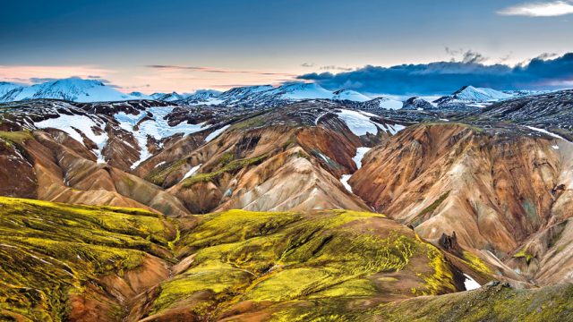 But no matter what you’ve read about the Highlands, nothing quite prepares you for your first encounter with Landmannalaugar. Ornamented and barnacled with geological features that look forged out of some deep subconscious—from multicoloured rhyolite (light-coloured, fine-grained volcanic rock) mountains, to gloriously bright-green lava fields, broken-up by winding blue rivers and streams, the area takes our breath away—literally. For, as the guide suggests, a good way to change perspective is to climb a crag or mountain. We pick the blue-black coloured (due to volcanic ash and lava flows) Mount Blahnjukur volcano to trek up, for a sweeping overview of the surrounding mountains and valley.