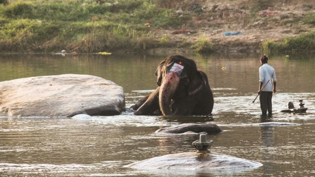 Lakshmi is the star-attraction of the Virupaksha Temple. I’d met her a few days earlier under not-so-happy circumstances inside the temple precincts, as she stood inside a pavilion clearly too small for her blessing a never-ending line of delighted devotees with her tired trunk. I watched her now as she made her way to the middle of the river with the mahout on her back. Hazy images of statues, carvings and temples whirled through my mind, eliciting memories of the past few days that I had spent in Hampi.