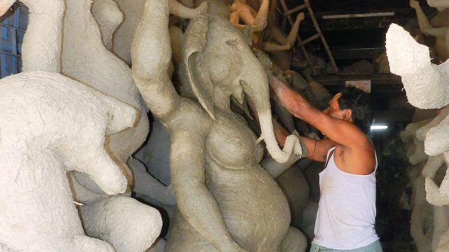 Since making idols of gods and goddesses is a highly seasonal job, for the rest of the year, the artisans make statues of famous personalities, decorative pieces, etc. Earlier, the tradition of image-building used to be handed over from one generation to the next. Prices of idols are not in keeping with escalating costs with the result that traditional crafts-person are opting out of trade, only to be replaced by ‘roaming’ craftsmen. Now most workshops have to hire temporary help to complete the job. “We used to put a part of ourselves into the idols as we painstakingly shaped our Ma,” lamented Pal. “Today, this is looked upon as just another job. So you won’t find the mark of the liveliness in the images.”