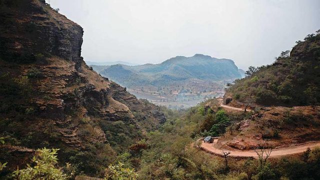 Perched atop a high ledge the langur sits silhouetted against the pre-dawn sky, its white fur barely catching the first rays. It is alone, and its distant gaze looks inward. We are both infused with the rich stillness around us as the dawn paints the towering cliffs scarlet. Nestled below is an idyllic valley textured with tilled patches. I descend down sharp switchbacks, past sheer walls of sandstone striated with veins of river pebbles. Contents of a river bed at 2,500 feet reveals much about the upheavals these lands have seen. At the valley floor, a turn in the red earth track skirts a tall palash aflame with spring, and brings me to a tribal village. A dry wind whistles through empty hutments. The village folk are away working on road construction. I saw them camped out near town, in fire-lit huddles. The unfit are left behind, in rural grace.