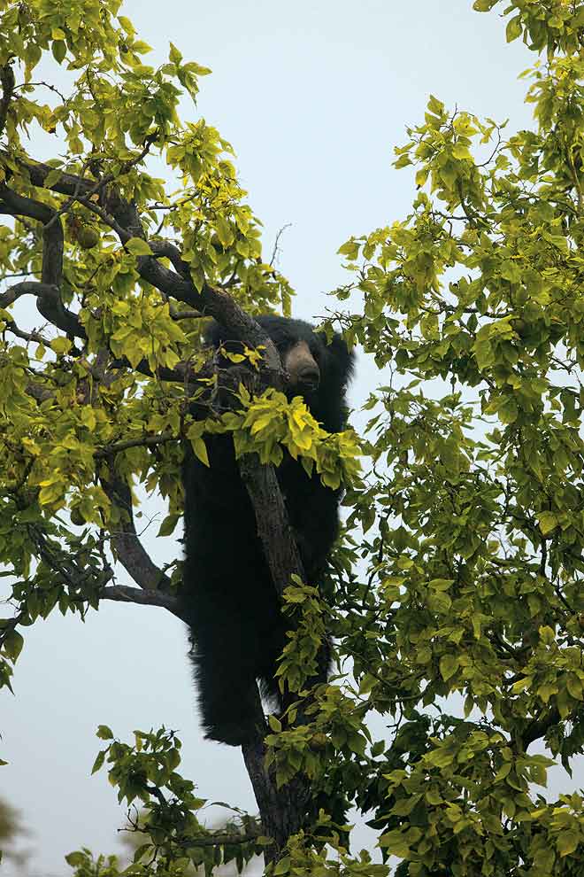 We drove through thick forest, accompanied by that rarest of feelings—of being utterly alone. Our forest guard gave a low whistle. “Reech,” he said, pointing upwards. At the very top of a tree was a shaggy black blob. It moved, revealing a large sloth bear, almost six feet long from nose to tail. The bear looked up, saw us, and began climbing down, using both paws to grip the trunk like a coconut-picker. “Hold tight,” said Yogesh, “sloth bears often charge unprovoked.” But all it did was mosey around, 20 feet away, ignoring us completely.