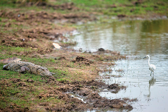 Entering the gates, we spotted a mugger (marsh crocodile) basking near a watering hole. An egret waded perilously close to its jaws, while a lone wild boar rooted around for tubers, head underwater. So single-minded was the boar in his search for submerged goodies that he didn’t even come up for air. I called him Old Bill as he reminded me of a salty sea captain, with not a friend in the world save for a foolhardy egret and a smiling mugger.