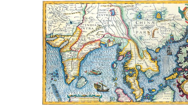 The exquisite India Orientalis by Mercator and Jodocus Hondius, from their Atlas sive cosmographicae meditations, 1606, is one of the most important examples of European depiction of India, made more than a century after Vasco da Gama’s arrival in India. There is very little unknown territory and a large number of the place names mentioned within correspond to cities or regions still in existence today—‘Jessalmer’, Berar, Daulatabad.