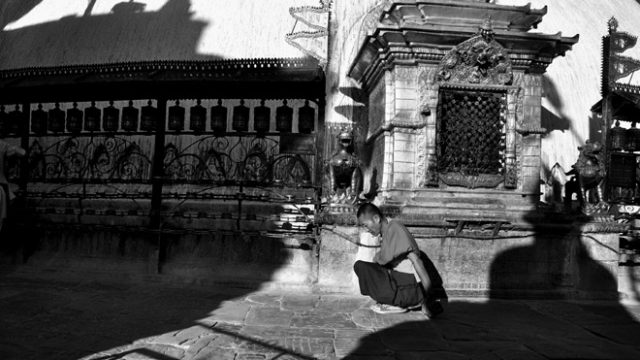 Swayambhunath temple in Kathmandu Valley is popular with visiting photographers. On my trips to Nepal I make it a point to go either at dawn or sunset when the light is most interesting. A few years ago on an assignment for Lonely Planet I strolled up to Swayambhunath on a monsoon evening. The sun was filtering through the clouds, and the atmosphere was fresh with the dust washed away by a sharp rain shower. I just stood for some time and watched life go by. The sun was sinking behind me casting interesting shadows on the stupa, but nothing particularly special was happening to make a photograph. Then I noticed a lama prostrating on the ground making the traditional circumambulation. Moving quickly I found a spot where the low angled sun had illuminated the stupa in between the shadows. I waited for the man to come around again into the sun and then took half a dozen shots. Luckily, one of them turned out right.