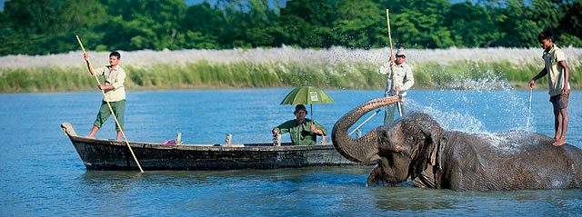 The kans and the elephant grass swayed gently in the evening breeze, as Ranikali stomped along. The rains had helped the grass grow to incredible heights, and we were quite submerged, sailing in a sea of grass broken only by stray trees full of chattering birds. The forest beyond the Rapti was clothed in a soft mist as we descended into a narrow channel of the river meandering through the grassland. Suddenly, there were big crashing sounds and Ranikali’s stomach started to rumble. There was a group of five rhinos bathing in the water, all of whom had stopped to look at us warily. As Rajudai gently guided the elephant towards the beasts, I realised that the crashing sound was coming not from the rhinos in the water, but from one in the tall grass, who had wandered in right in front of Ranikali. From the length of its horn, it seemed like a female, and for one heart-stopping moment it seemed that the startled rhino was going to charge. Then it gave way in front of the elephant’s larger bulk, and splashed ungainly into the water.