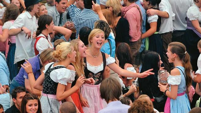 It would be easy to reduce Oktoberfest to just mere drunken revelry… It is that too, but aside from a few brawling or excessive sods, it’s a giant party, full of gaiety, abandon and camaraderie, where a large number of German (and often, other visiting nationals) men don their lederhosen (leather pants) and hats, and the ladies their dirndls (gaily coloured full-skirted pinafores over frilly bodices), and let their hair down. Mind you, this tradition of letting your hair down is taken seriously by the people of the land. In keeping with good health and propriety notions, the local government tried to impose a ban on smoking in the tents this year. The government fell.