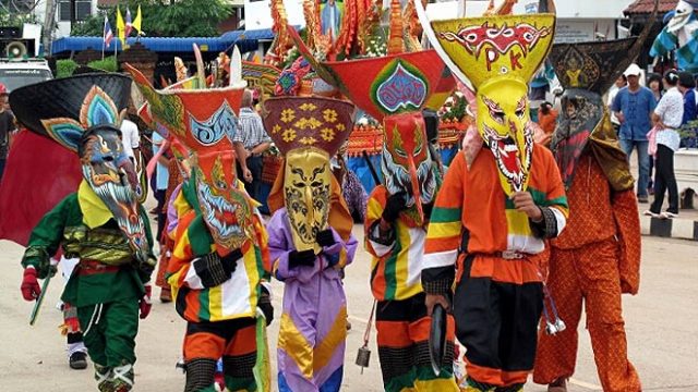 Dan Sai (Loei province), in north-eastern Thailand, will celebrate its annual Bun Luang (Boon Prawat) and Phi Ta Khoon festivals from June 26-28, 2015. The Bun Luang festival is a merit-making festival where local people gather at the temple to listen to sermons in honour of the 13 sermons delivered by Prince Vessandron. Apart from the holy rituals, esecially at the Wat Pon Chai Temple, visitors, especially photographers, will enjoy the parade on June 27, where people will sing and dance or siply strike a pose, wearing huge masks made from carved coconut-tree trunks, topped with wicker work ahd sticky-rice steamers and dressed in colourful clothes.