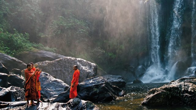 Then came the gods. As carvings, these early specimens (9th–10th centuries AD) offered none of the scale that the later temples out on the plains did. Wonder, though, was not in short supply. What these lacked in size, they made up in location and the adventure of ‘discovering’ Indra, the ruler of heaven, reclining right below where the river flows over a ledge; Ganesha, trunk and belly quite hidden unless you looked just right at the seemingly impossible to reach rock face. And then the hundreds of shivalingas, phallic symbols of creativity, magically carved into the riverbed underneath the clear flowing Kbal Spean River.