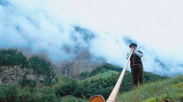 Yodels also inspired the warm tones of the alphorn, the ‘mobile phone of the Alps’. Traditionally, these enormous instruments were carved from the trunks of pines that grew on hillsides. They are now designed with blocks of wood and fitted with a wooden mouthpiece.