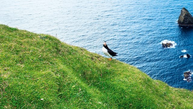 The sea birds build their nests in rock crevices of steep sea cliffs to keep them safe from predators. Puffins also build on land, in burrows as deep as two metres. Though most of their time is spent on the ocean—they live on a diet of fish and salt water—they come on land to nest in the summer months. They line their nests with soft grass and feathers and prepare to welcome a single chick, or puffling. Puffins mate for life and have a life span of about 20 years.