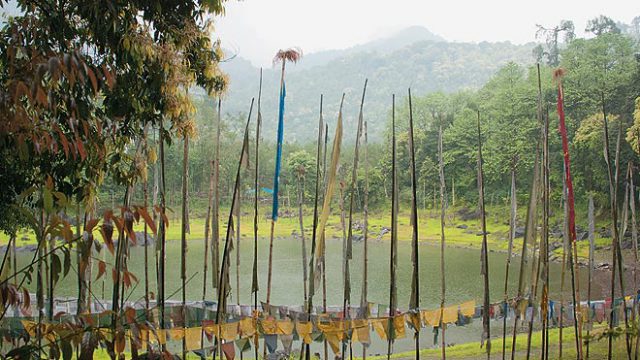 My colleague Sujatha Padmanabhan and I were at Khecheopalri Lake, one of western Sikkim’s wetland jewels. Set amidst densely forested hills, the lake is ecologically important, and being sacred to Buddhists and Hindus, has remained strictly off limits for human use other than pilgrimage and visits. It was originally called Kha-Chod-Palri (‘wish-fulfilling jewel’). From one lookout point high above the lake, its shape appears to be that of a footprint, and local Buddhist belief is that this is where the goddess Tara Jetsun Dolma (the Buddha’s mother) stepped; the Hindus believe it is Shiva’s footprint. Scientists, somewhat more mundanely, say that the lake is a result of ancient glacial action. Whatever the origin, the lake’s great cultural significance is borne out by the hundreds of prayer flags lining its banks and walkways, the various taboos and beliefs attached to it, the dozen or more folklore and mythological tales explaining its origins…and the quiet resentment towards badly behaved tourists who desecrate its surrounds.