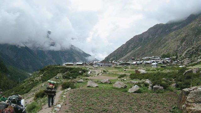 We were supposed to have camped in the meadow at Gagnan on the third day, but rain forced us to halt earlier. A half-hour walk on day four brought us to this meadow carpeted with spinach-like vegetation. Our destination was Kyarkoti, an arduous 15km trek away. At 12,220ft, we were well above the treeline, and the first symptoms of altitude sickness were showing.