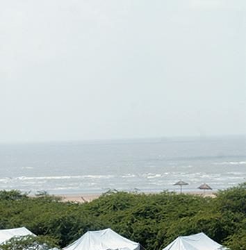 I’m at The Beach at Mandvi Palace. It sits in the middle of the 450 acres of mildly domesticated jungle that make up the backyard of Vijay Vilas, the summer retreat of the former rulers of Mandvi. Rajesh Singh, the manager, tells me that in bygone years, when the family and guests came out for hunts and suchlike, tent camps would come up around the palace. Right now, it is the only privately owned beach in India, with the property extending right up to the waterline. I hear that the family has refused offers from various hospitality chains to take over and run the palace as a hotel.