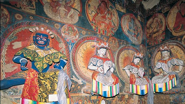 The murals in the du khang and fragments from the original wall paintings in the ambulatory demonstrate that when Yeshe-Od founded the monastery in 996 CE, the artistic culture had a provincial character, with influences deriving from Kashmir and Ajanta (which earned Tabo the epithet ‘The Ajanta of the Himalaya’) in India to Dunhuang in China. A totally new aesthetic was introduced in the 11thcentury renovation of the monastery under the patronage of Changchub-Od.