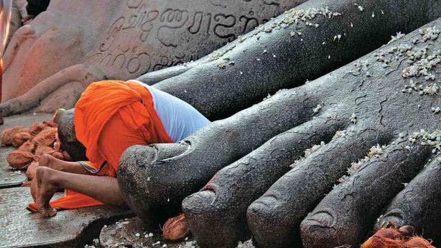In season, between September and July, Sravanabelagola gets about 4,000 visitors a day. It is the highlight of the Jain pilgrimage circuit in Karnataka. Even during the off-season, says the official at Tourist Information, about 500 people come every day, but just now we seem to have plenty of elbow room. The village, a string of vegetarian hotels and shops selling ten-inch and five-inch Gomateswaras in every colour, lies between the two granite hills of Vindhyagiri and Chandragiri, which are dotted with shrines to the 24 tirthankars or ‘ford-crossers’.