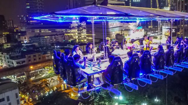 The high-altitude dinner table seats 22 patrons with specially equipped safety belts. The whole table is suspended by a 200-tonne European telescopic boom crane. Enjoy the four-course gourmet dinner prepared by Sheraton Grande Sukhumvit as you take in the skyline from the sky!