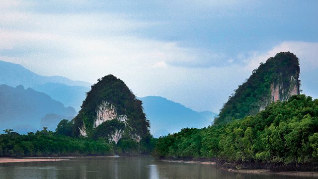 Chicken Island? It’s an unusual name for a behemoth of limestone and tropical vegetation. Later that day, the eponymous chicken neck comes into view as we round a bend, rising many hundreds of metres into the sky. There are barely visible rock climbers along the median reaches of the steep cliffs high above the water. Some have chosen to wear blue or bright red, otherwise they would be impossible to spot from the boat.