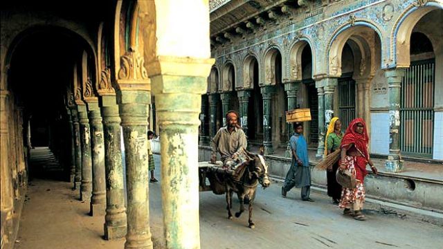 Under the shadow of the conical Kona Hill stands the neighbouring district town of Jhunjhunu. Our curiosity takes us to its famous Sati temple. The complex is massive, with 700 rooms for the pilgrims. We are uneasy with this overwhelming reverence for a barbaric system. But soon we are lost in the cheerful bustle of the mandi. Bihariji’s ancient temple in its midst is serene. A woman chants prayers under a dome, which is richly painted with scenes from the Krishnalila. Making our way through the alleys of the cloth market, we are among stalls spilling with bright winter vegetables and fruits, and amidst the bustle of men and cattle rises the massive Modi Haveli.
